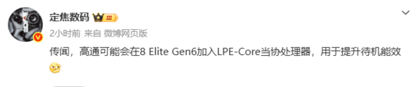 【CNMO科技消息】4月8日,数码博主“定焦数码”爆料称,高通可能会在骁龙8 Elite Gen6中加入LPE-Core当协处理器,用于提升待机能效。